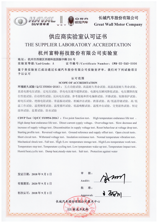 2018年9月,富特科技實驗室迎來好消息,正式成為了長城汽車授權認可的第二方實驗室,獲得其環境耐久試驗的授權。